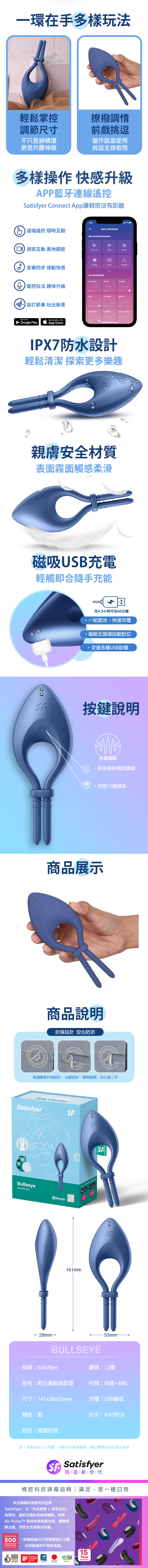 品名:Satisfyer|Bullseye|靶心 智能可調節男士鎖莖環 藍